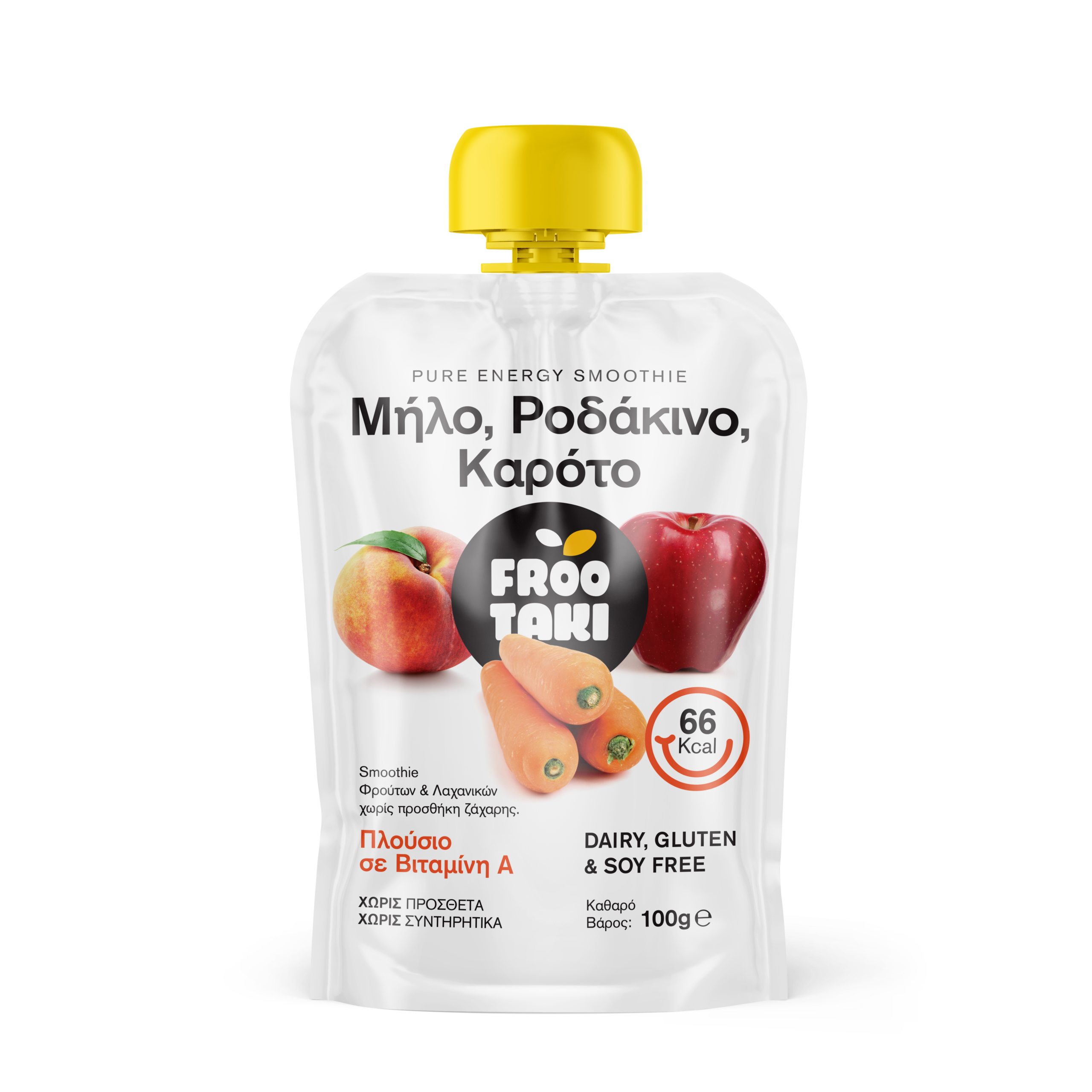 Πουρές φρούτων και λαχανικών από πολτό μήλου, ροδάκινου και καρότου.